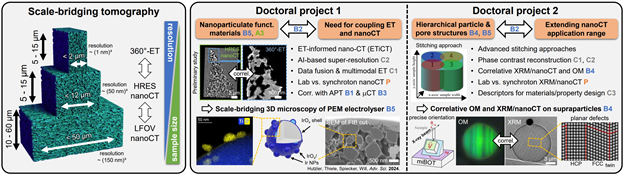 This doctoral project aims to develop advanced correlative 3D imaging workflows combining electron tomography (ET) and X-ray nano-computed tomography (nanoCT) for comprehensive, cross-scale analysis of hierarchical functional materials. The candidate will integrate ET’s nanoscale structural and chemical precision with nanoCT’s extended field of view to quantitatively characterize nanoparticulate systems such as catalyst layers in PEM electrolyzers. By correlating overlapping 3D datasets from both techniques, the project will establish methods for machine-learning-assisted image registration, segmentation, and super-resolution data fusion. The approach will bridge the gap between nm- and µm-scale structures, enabling analysis of particle networks, interfaces, and porosity across multiple length scales. Selected samples will be studied by ptychographic X-ray CT at synchrotrons to access ultimate spatial and analytical resolution. The developed methods will provide key 3D descriptors linking structure, functionality, and performance for data-driven materials optimization.